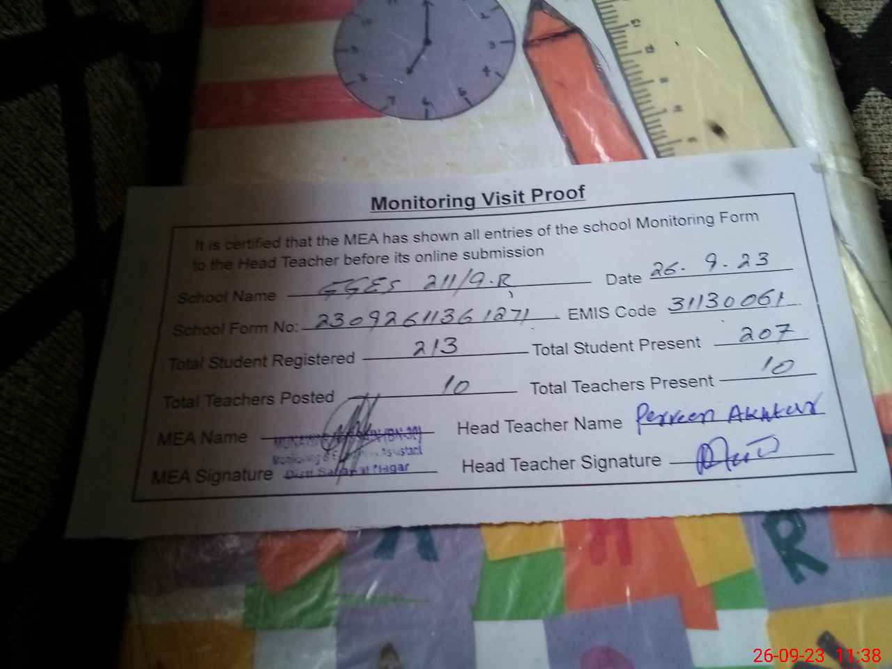 | Attendance Register | Head Teacher | MEA with School | Visit Proof |