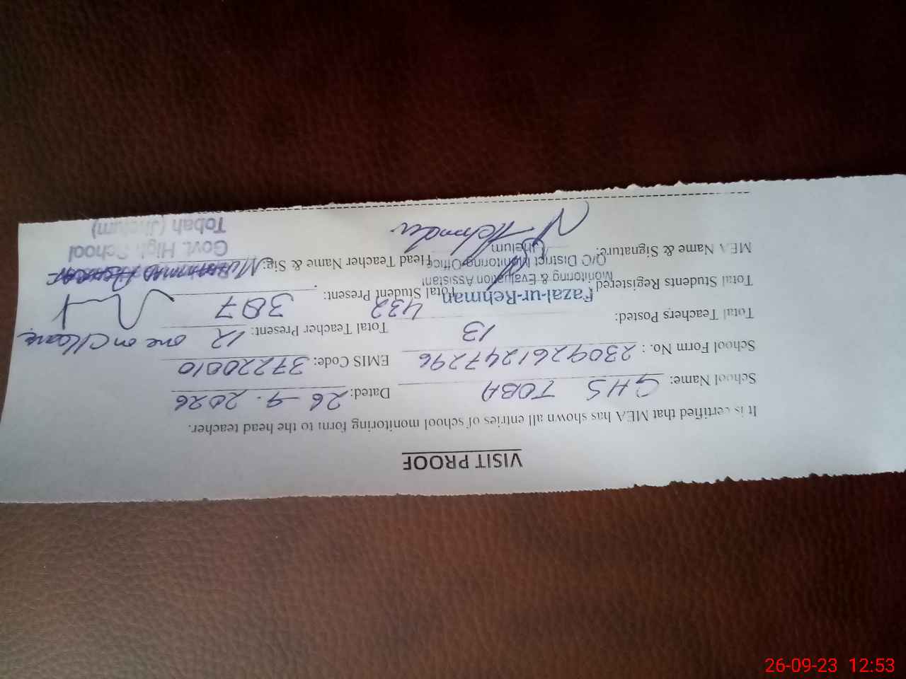 | Attendance Register | Head Teacher | MEA with School | Visit Proof |