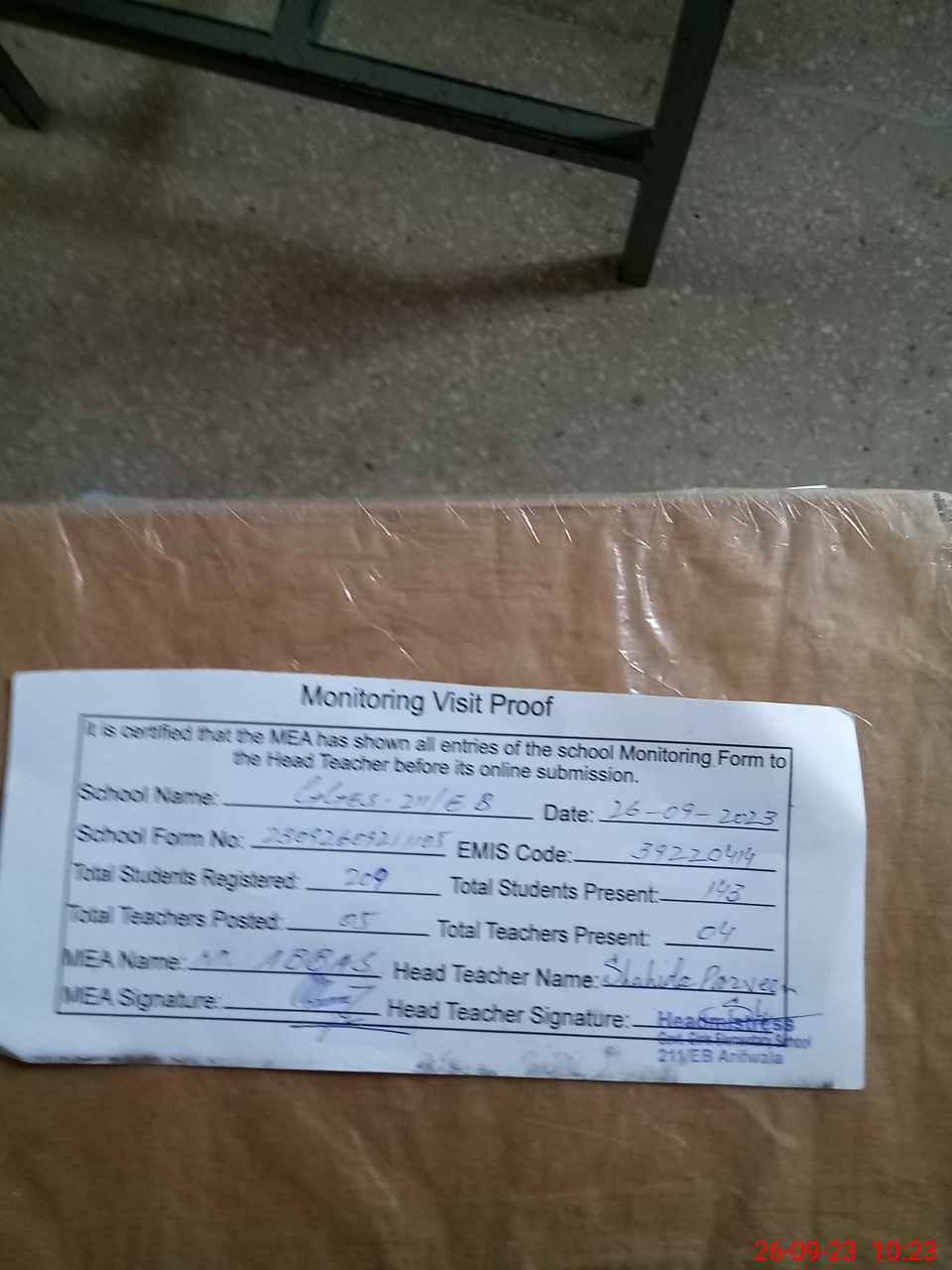 | Attendance Register | Head Teacher | MEA with School | Visit Proof |