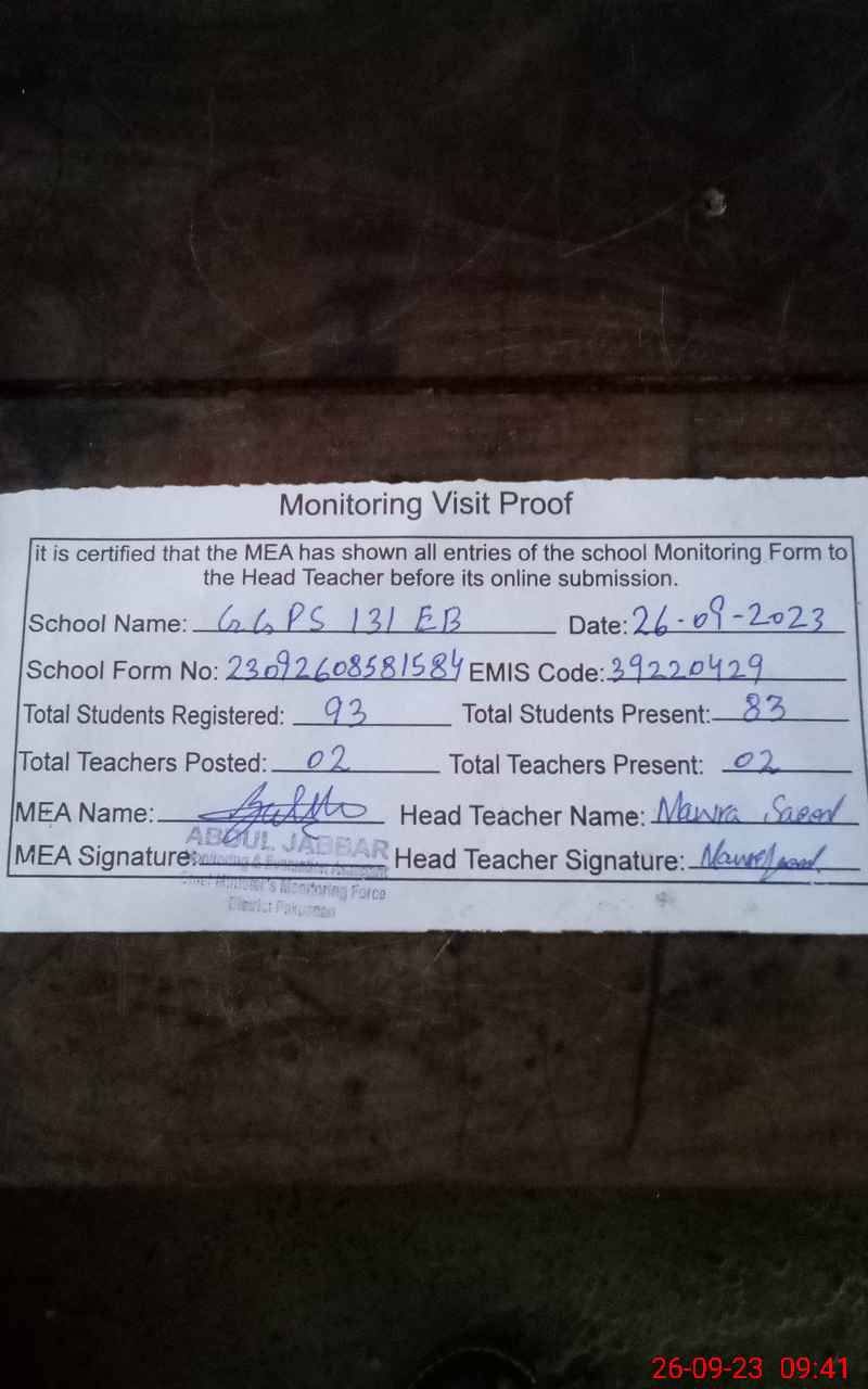 | Monitoring Date: 26-09-2023 | Start Time: 26-09-2023 08:58 AM | End Time: 26-09-2023 09:42 AM | Name of MEA: AB**** JA**** | |