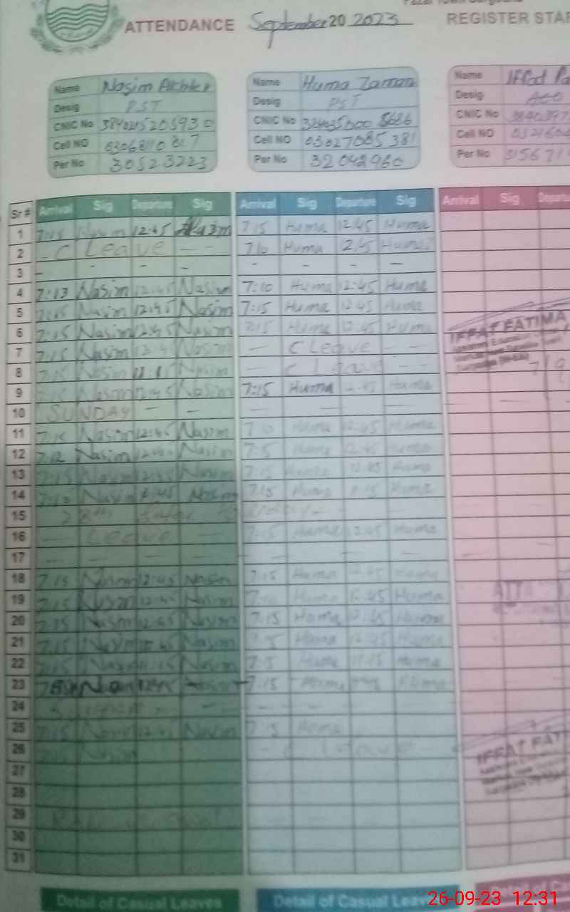 | CNIC | Full Name | Designation | R/C | Absence During Last Calender Month |