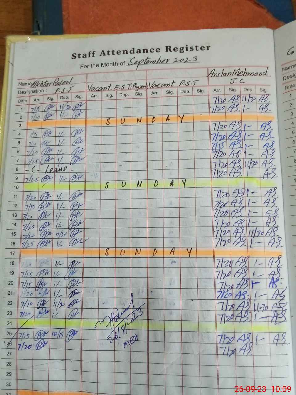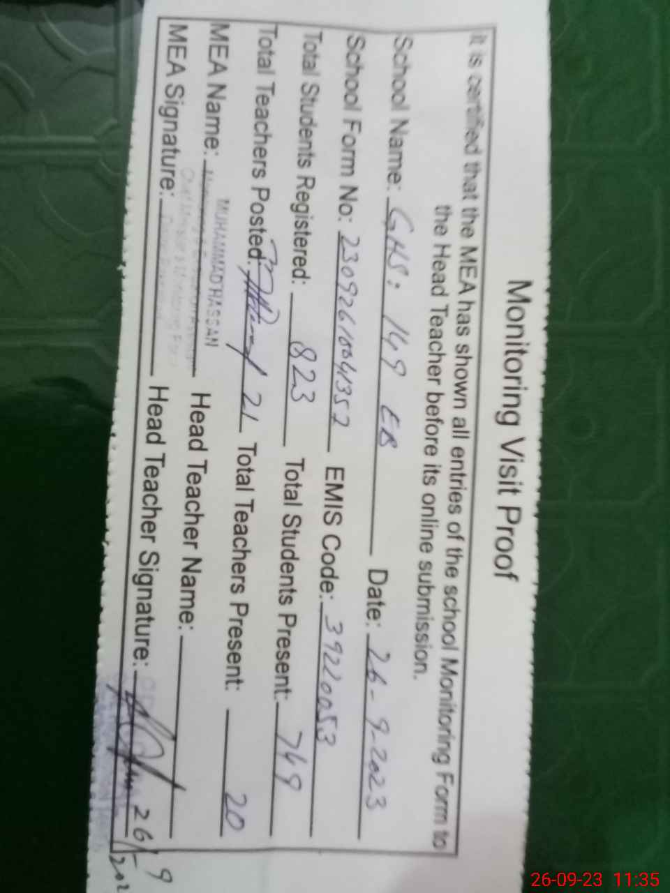 | Attendance Register | Head Teacher | MEA with School | Visit Proof |