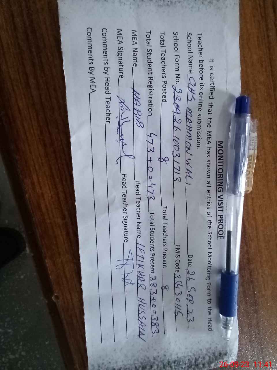 | Attendance Register | Head Teacher | MEA with School | Visit Proof |
