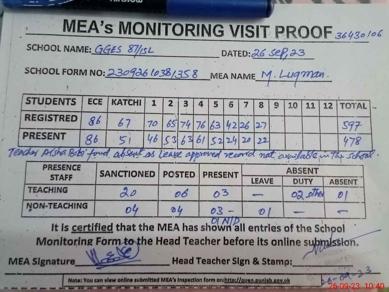 | Attendance Register | Head Teacher | MEA with School | Visit Proof |