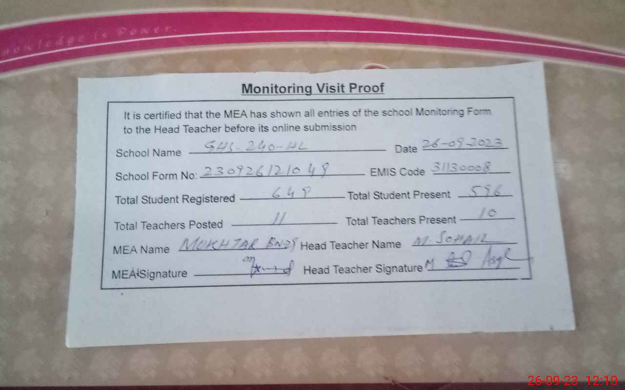 | Certified that this School was Inspected by the Undersigned MEA/DMO Today and the Information Stated Above is as Per Record. | |||||