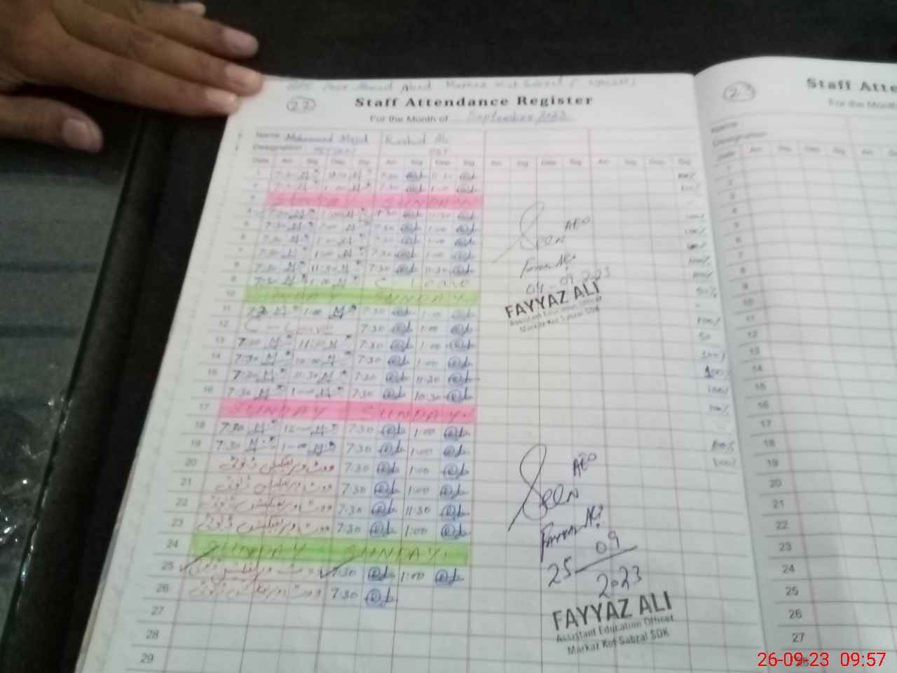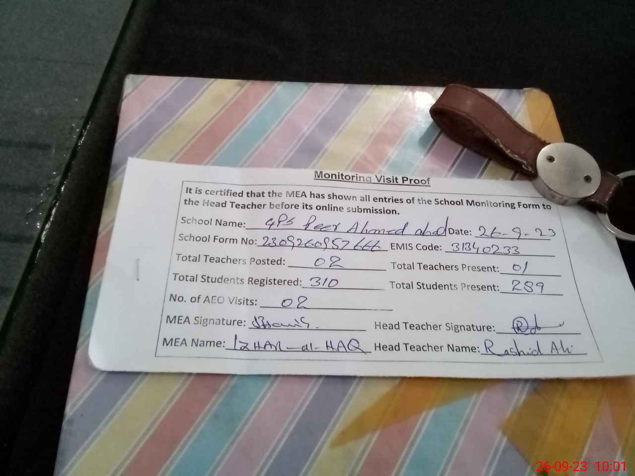 | Monitoring Date: 26-09-2023 | Start Time: 26-09-2023 09:40 AM | End Time: 26-09-2023 10:04 AM | Name of MEA: Mu**** Iz**** UlHa**** | |