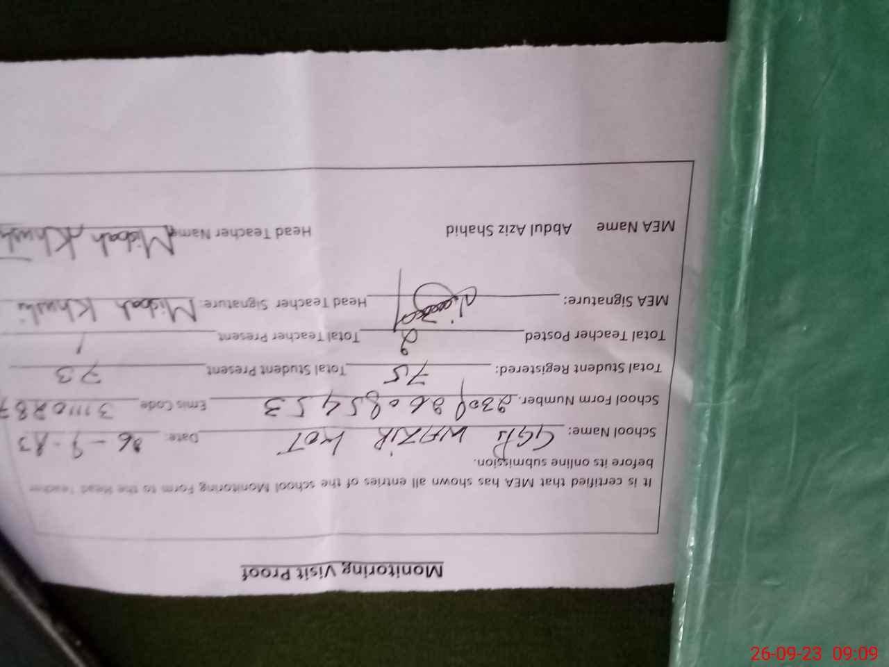| Attendance Register | Head Teacher | MEA with School | Visit Proof |