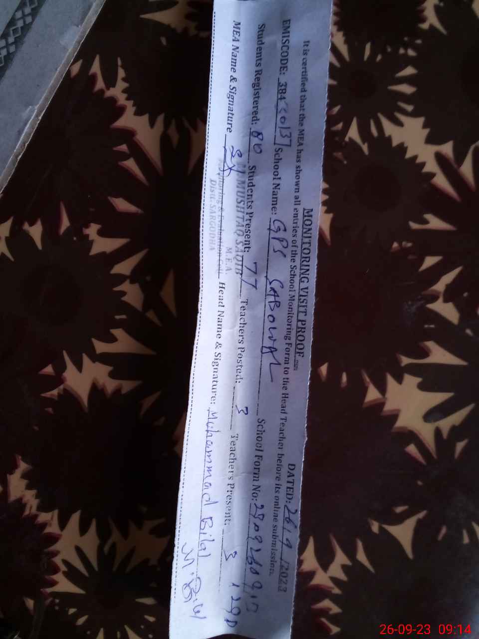 | Name: MU**** BI**** Designation: (School Headmaster's/Headmistress's) PST Phone/Cell Number: 03**** |