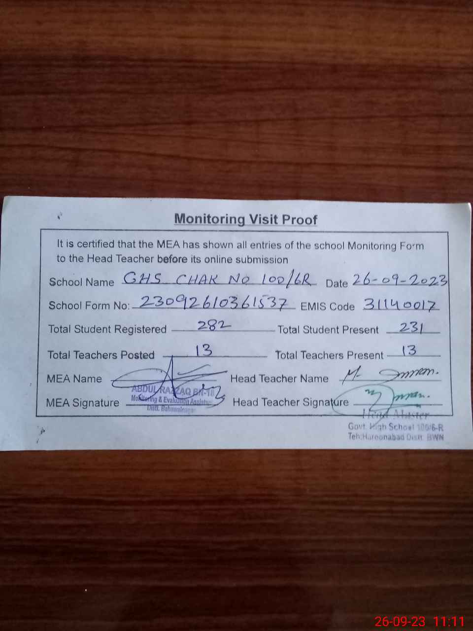 | Attendance Register | Head Teacher | MEA with School | Visit Proof |