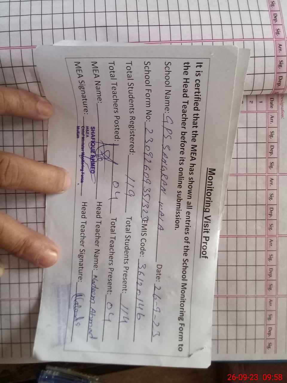 | Attendance Register | Head Teacher | MEA with School | Visit Proof |