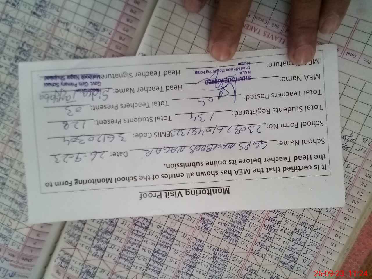 | Attendance Register | Head Teacher | MEA with School | Visit Proof |