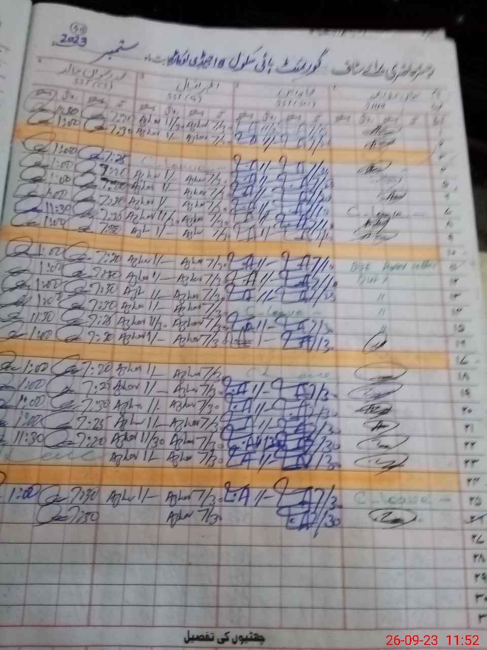 | No. of Students Present - Male | 4 | 0 | 27 | 20 | 18 | 26 | 25 | 37 | 60 | 71 | 78 | 43 | 40 | 449 | ||