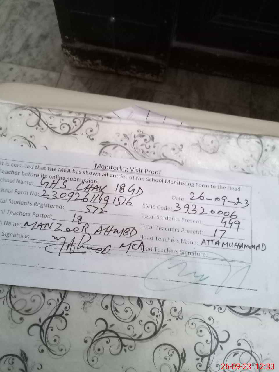 | EMIS Code: 39320006 | Name of School: GHS CHAK NO. 18/G.D | |||