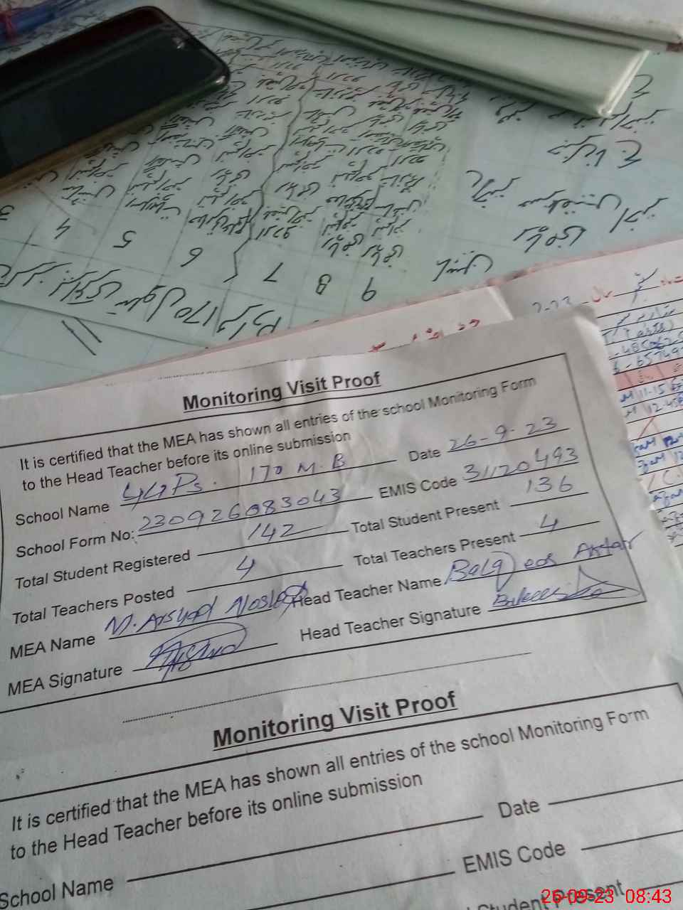 | Attendance Register | Head Teacher | MEA with School | Visit Proof |