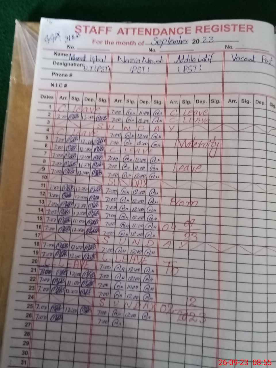 | Name: MU**** IQ**** Designation: (School Headmaster's/Headmistress's) PST Phone/Cell Number: 03**** |