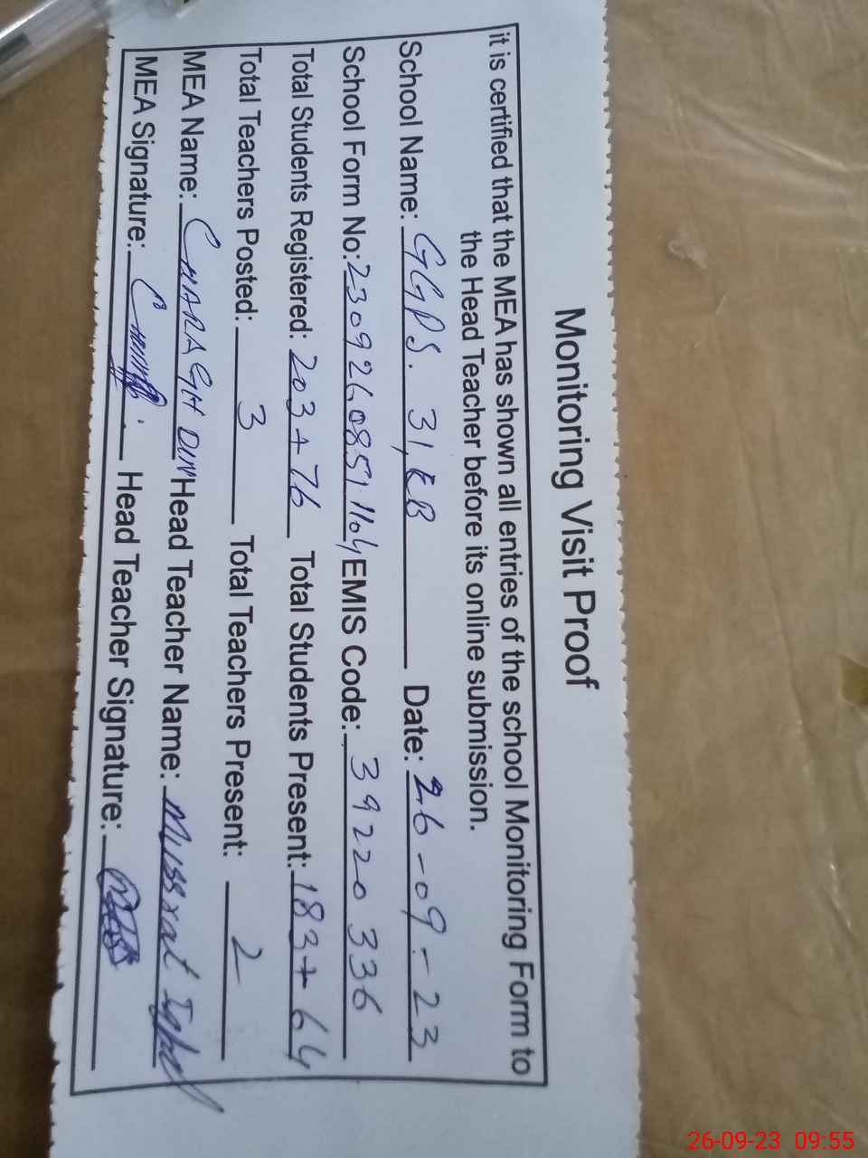 | Attendance Register | Head Teacher | MEA with School | Visit Proof |