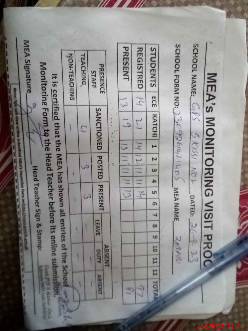 | Attendance Register | Head Teacher | MEA with School | Visit Proof |