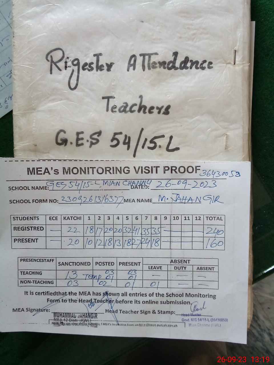 | Attendance Register | Head Teacher | MEA with School | Visit Proof |