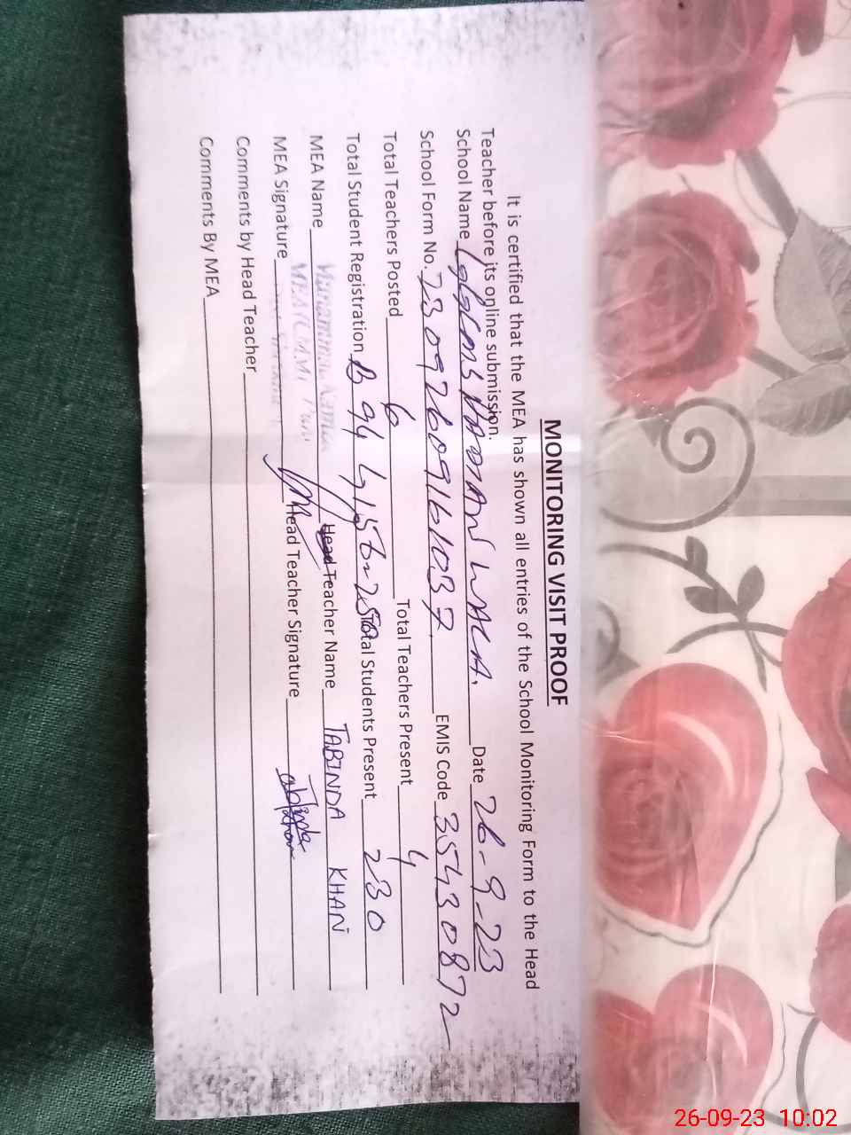| Attendance Register | Head Teacher | MEA with School | Visit Proof |