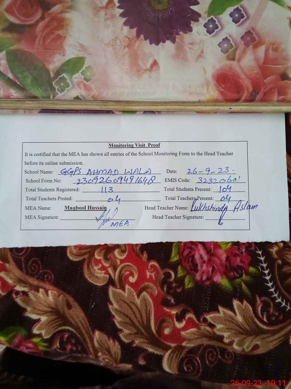 | EMIS Code: 32320601 | Name of School: GGPS AHMAD WALA | |||