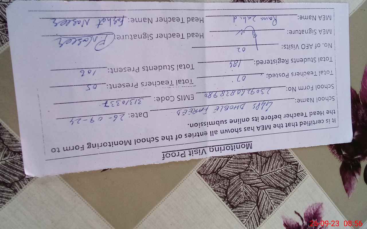 | Certified that this School was Inspected by the Undersigned MEA/DMO Today and the Information Stated Above is as Per Record. | |||||