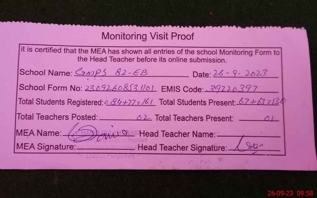 | EMIS Code: 39220397 | Name of School: GMPS 82/EB PO 66/EB ARIFWALA DISTT PAKPATTAN | |||