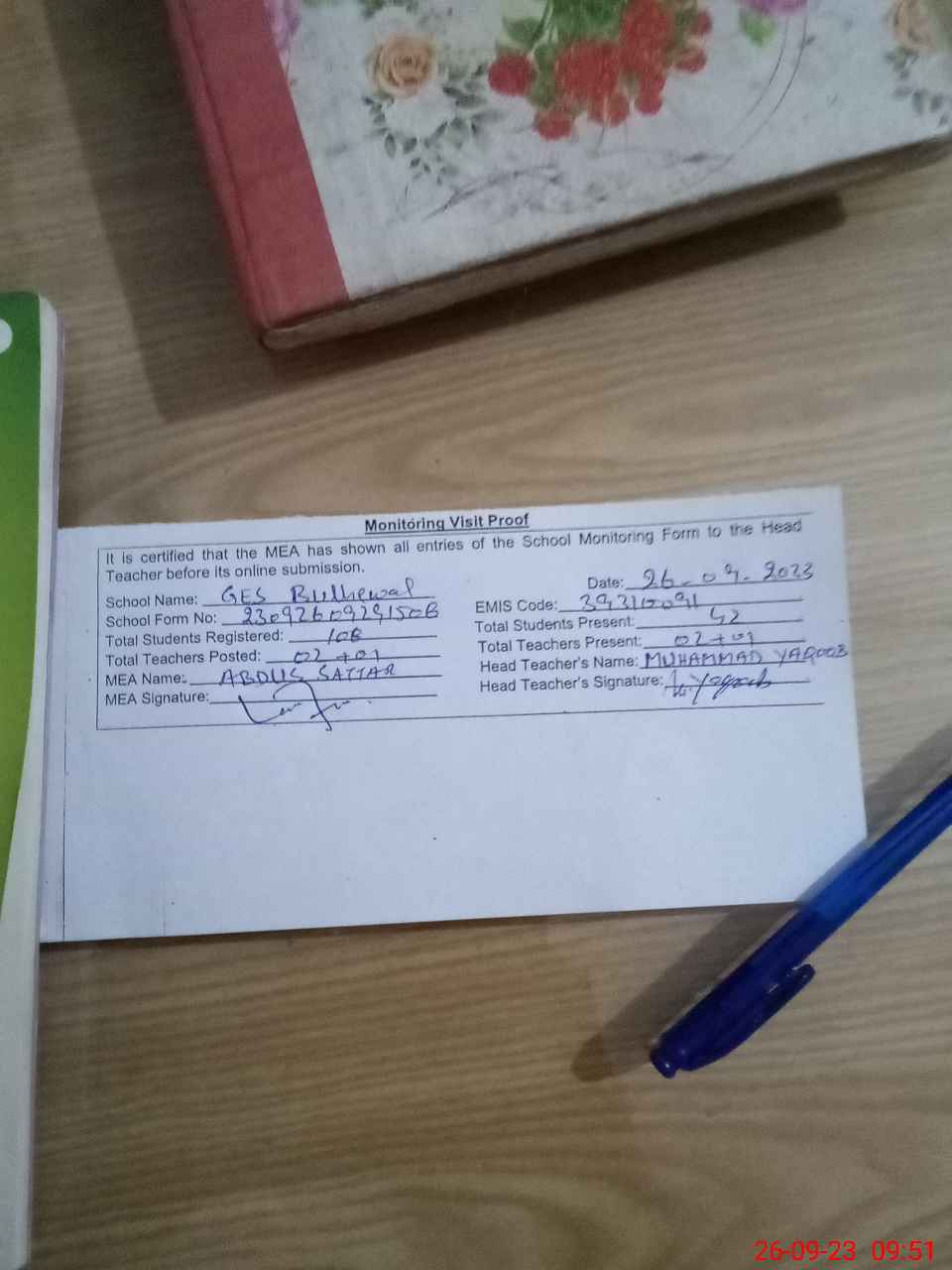 | Attendance Register | Head Teacher | MEA with School | Visit Proof |