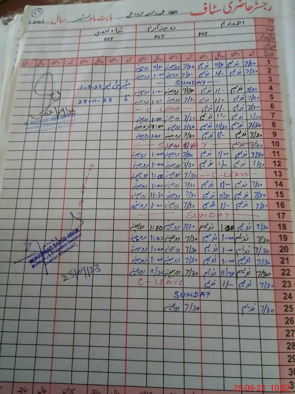 | CNIC | Full Name | Designation | R/C | Absence During Last Calender Month |