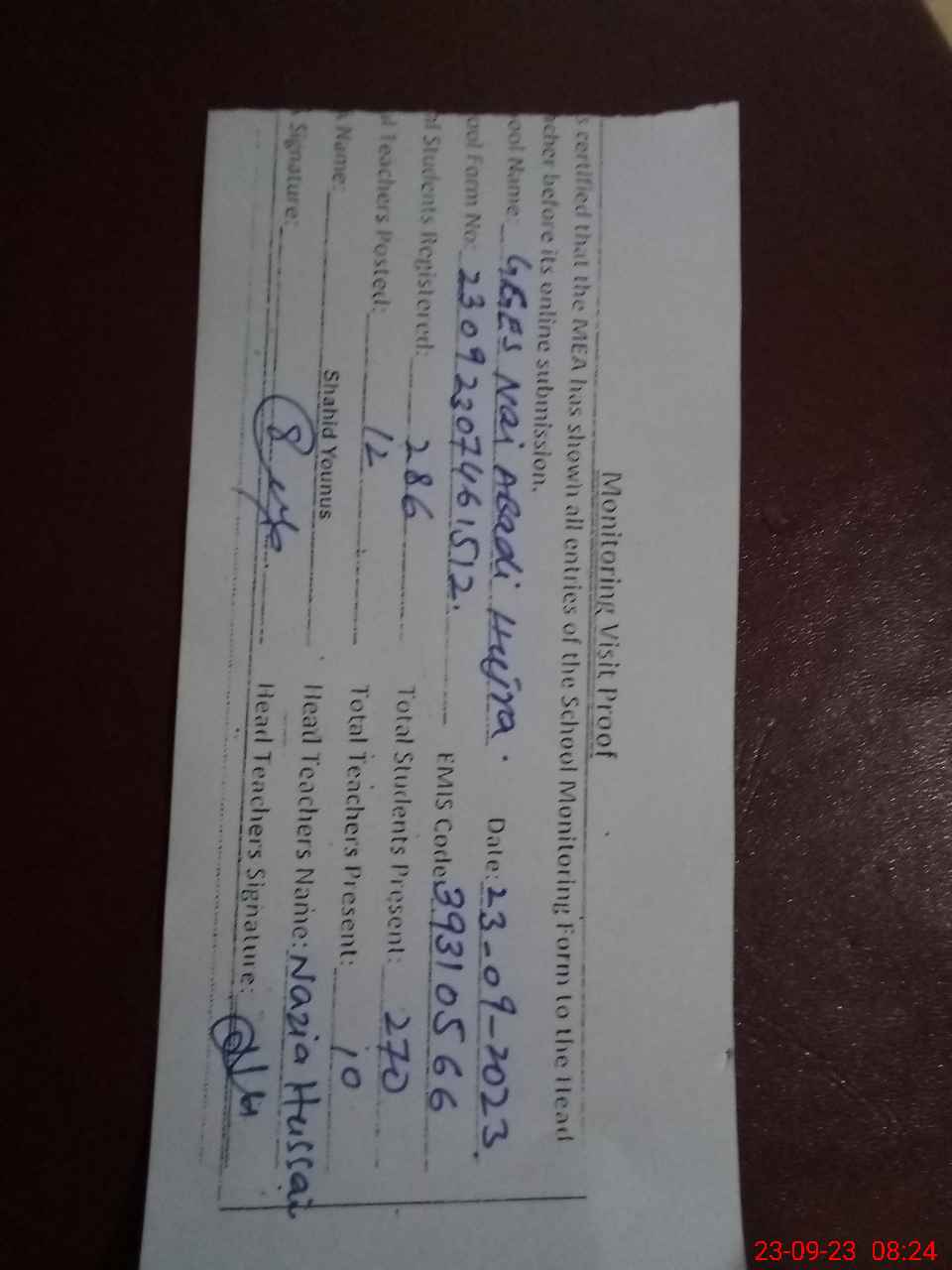 | Attendance Register | Head Teacher | MEA with School | Visit Proof |