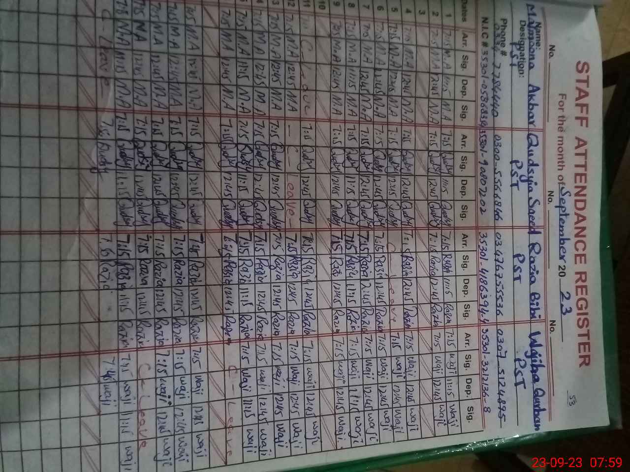 | CNIC | Full Name | Designation | R/C | Absence During Last Calender Month |