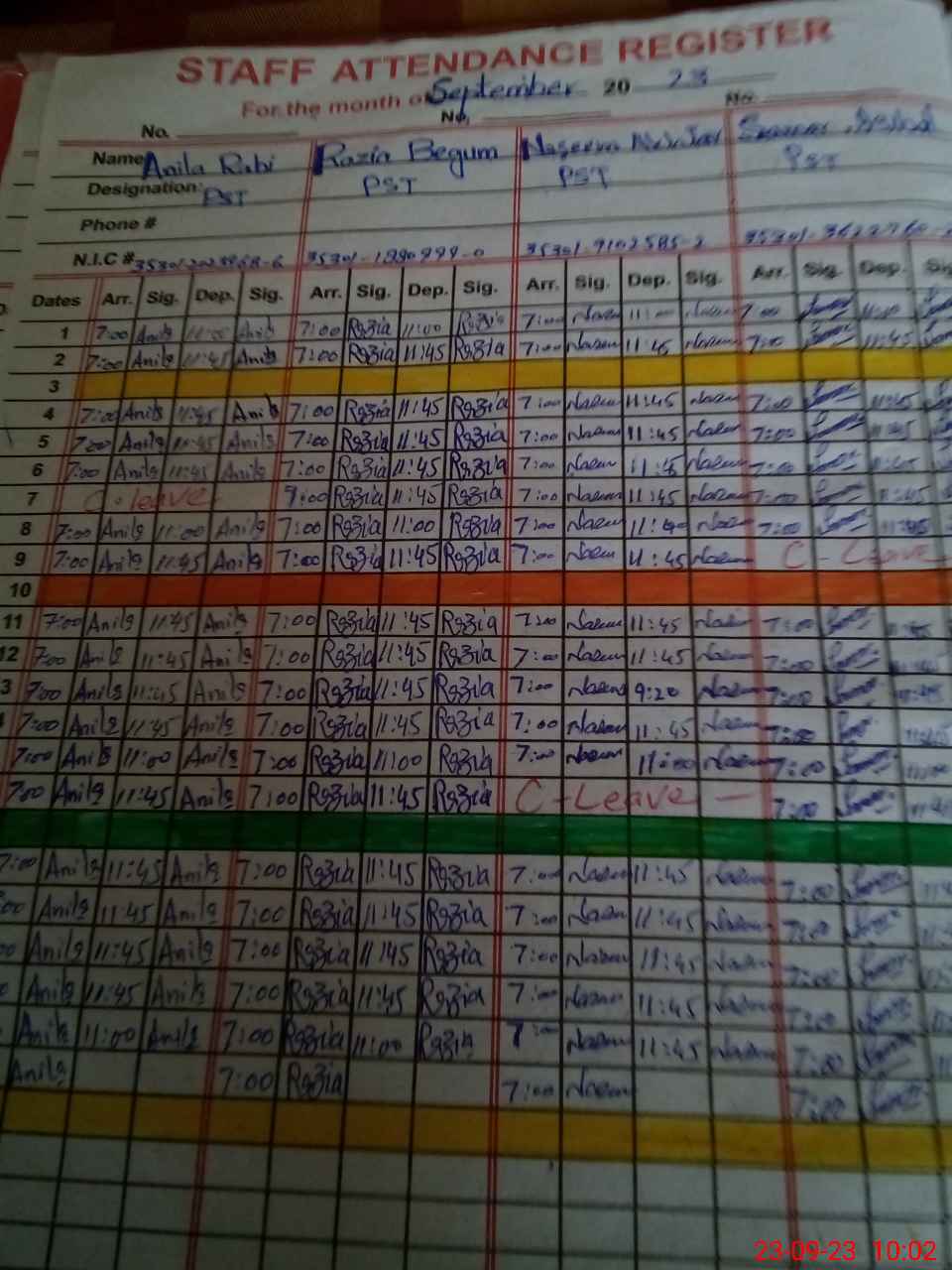 | CNIC | Full Name | Designation | R/C | Absence During Last Calender Month |