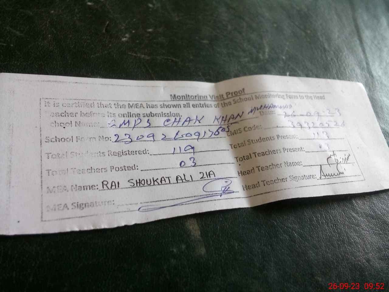 | Monitoring Date: 26-09-2023 | Start Time: 26-09-2023 09:17 AM | End Time: 26-09-2023 09:52 AM | Name of MEA: SH**** AL**** ZI**** (R**** | |