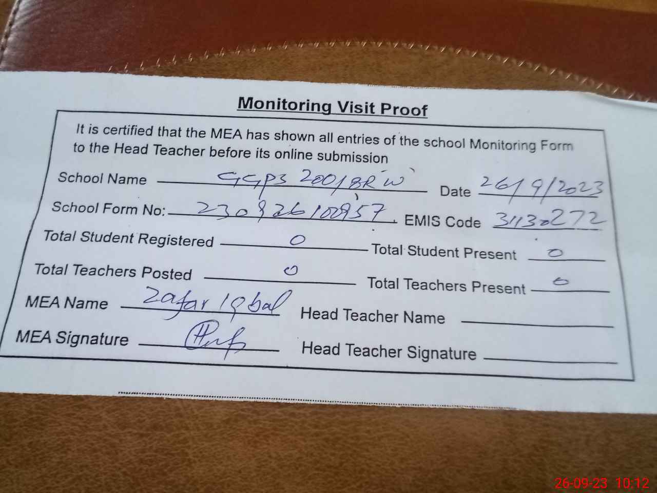 | Attendance Register | Head Teacher | MEA with School | Visit Proof |