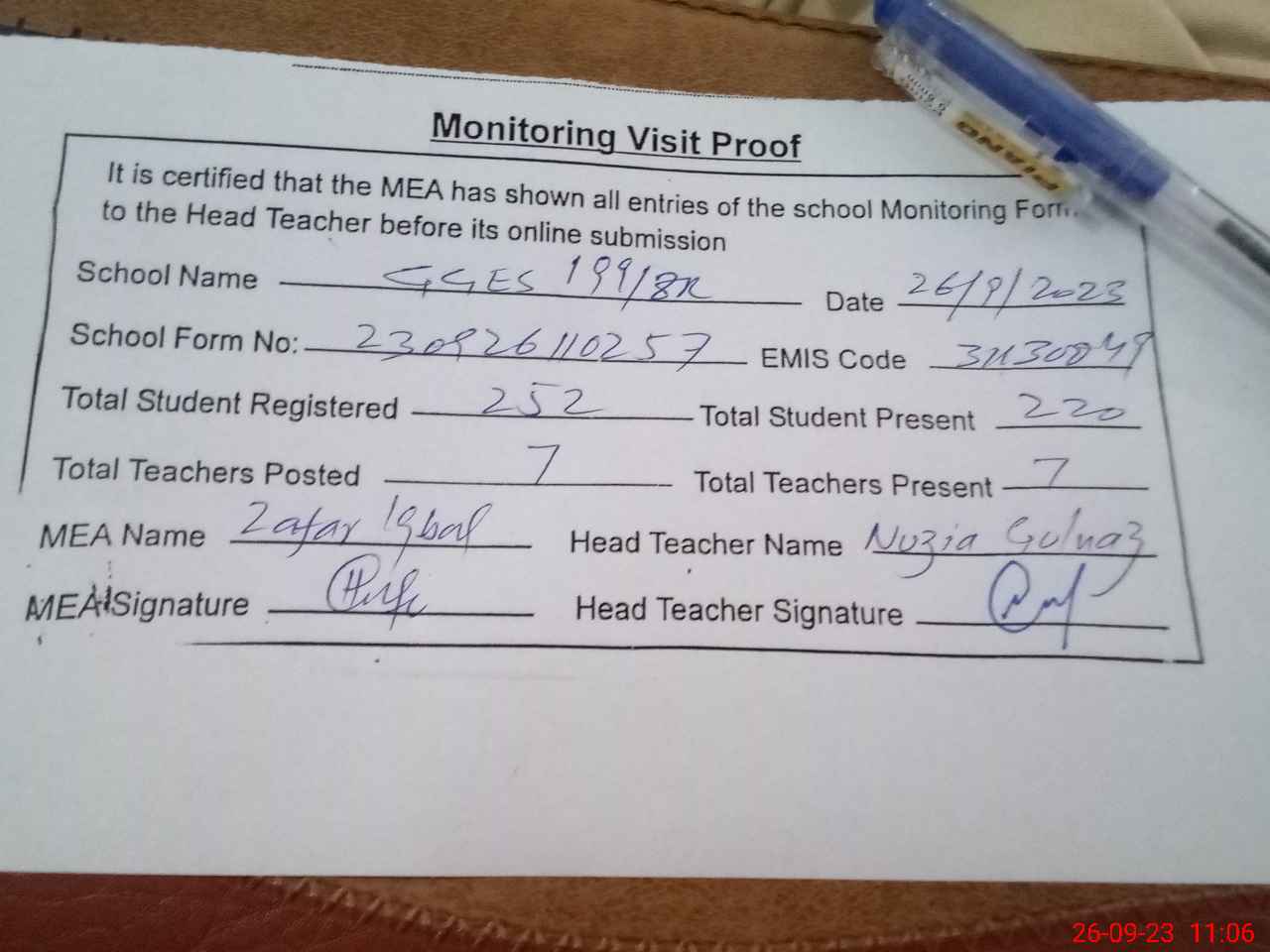 | Attendance Register | Head Teacher | MEA with School | Visit Proof |