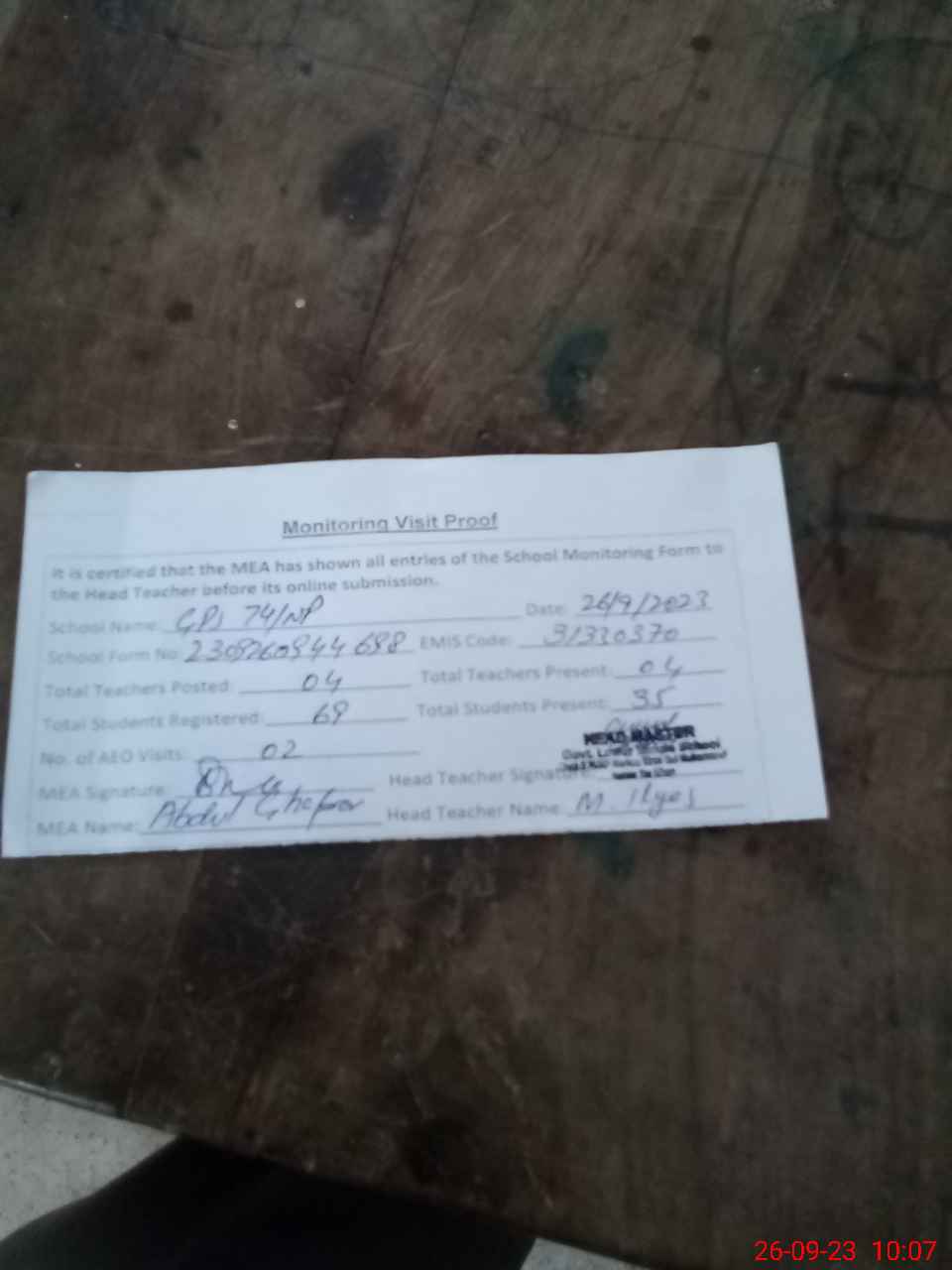 | Attendance Register | Head Teacher | MEA with School | Visit Proof |