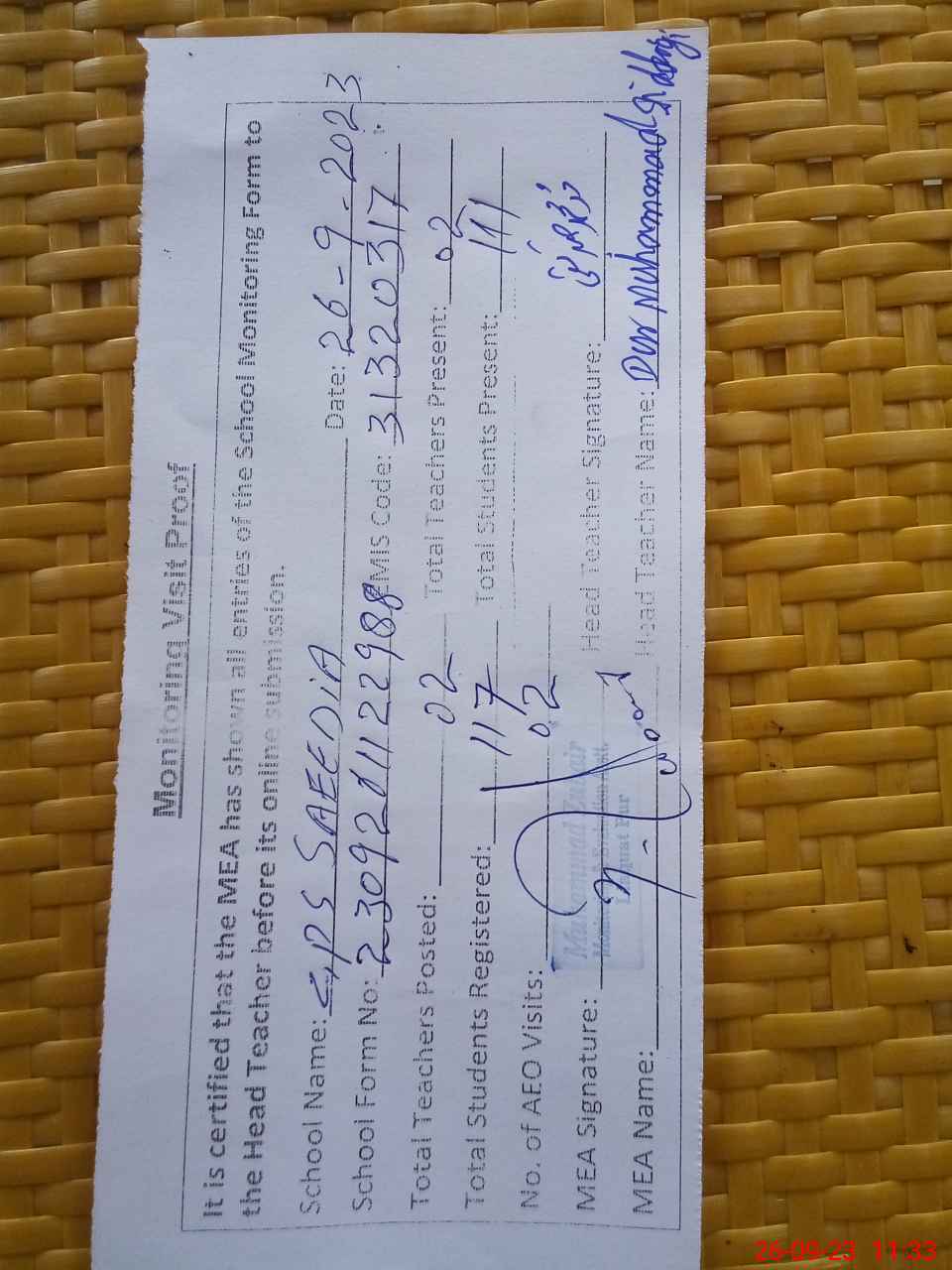 | Attendance Register | Head Teacher | MEA with School | Visit Proof |