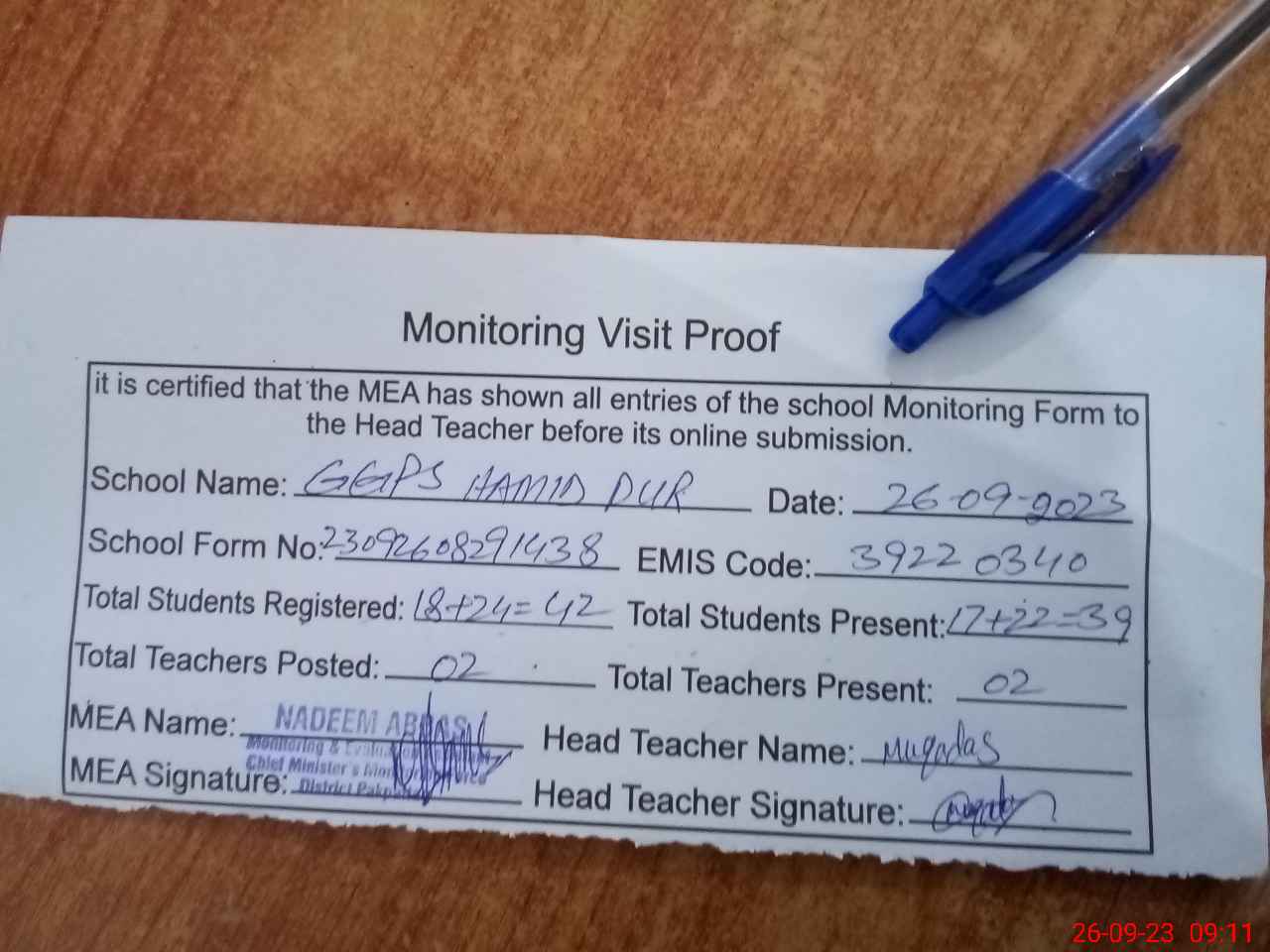 | Attendance Register | Head Teacher | MEA with School | Visit Proof |