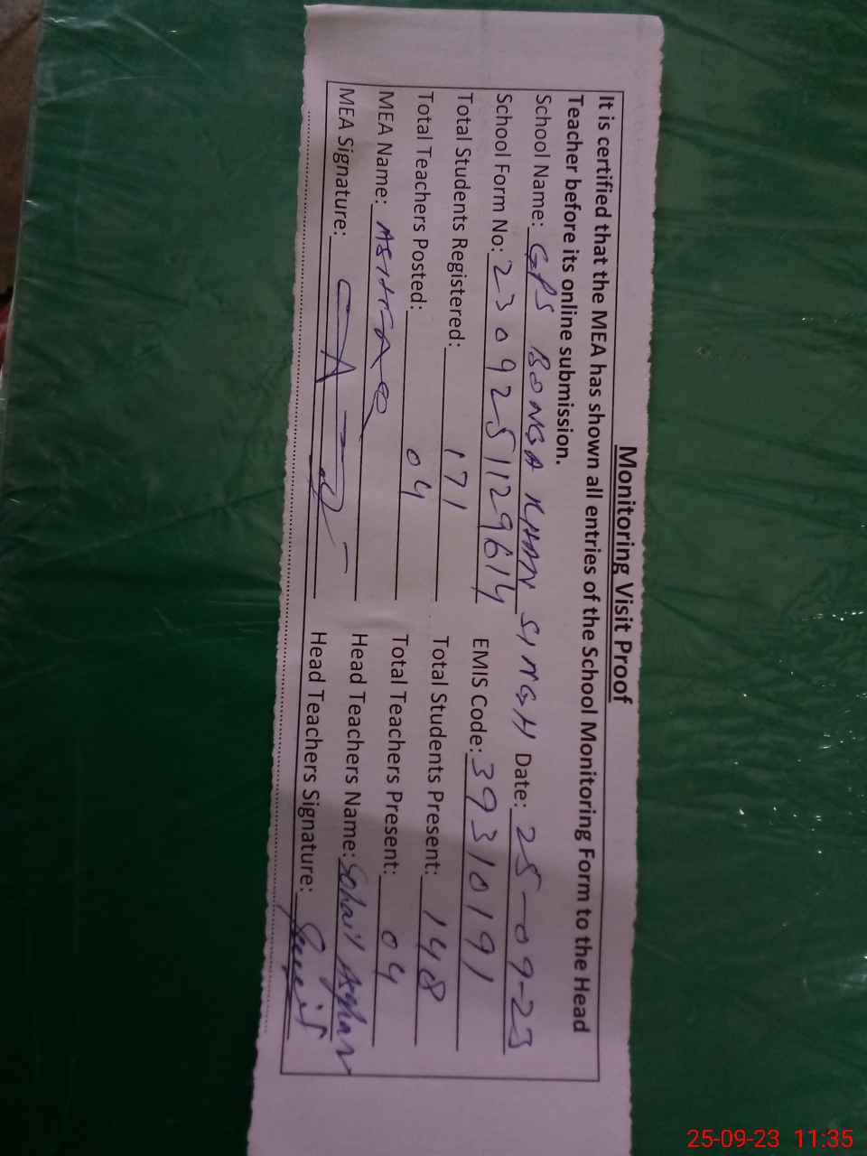 | Attendance Register | Head Teacher | MEA with School | Visit Proof |
