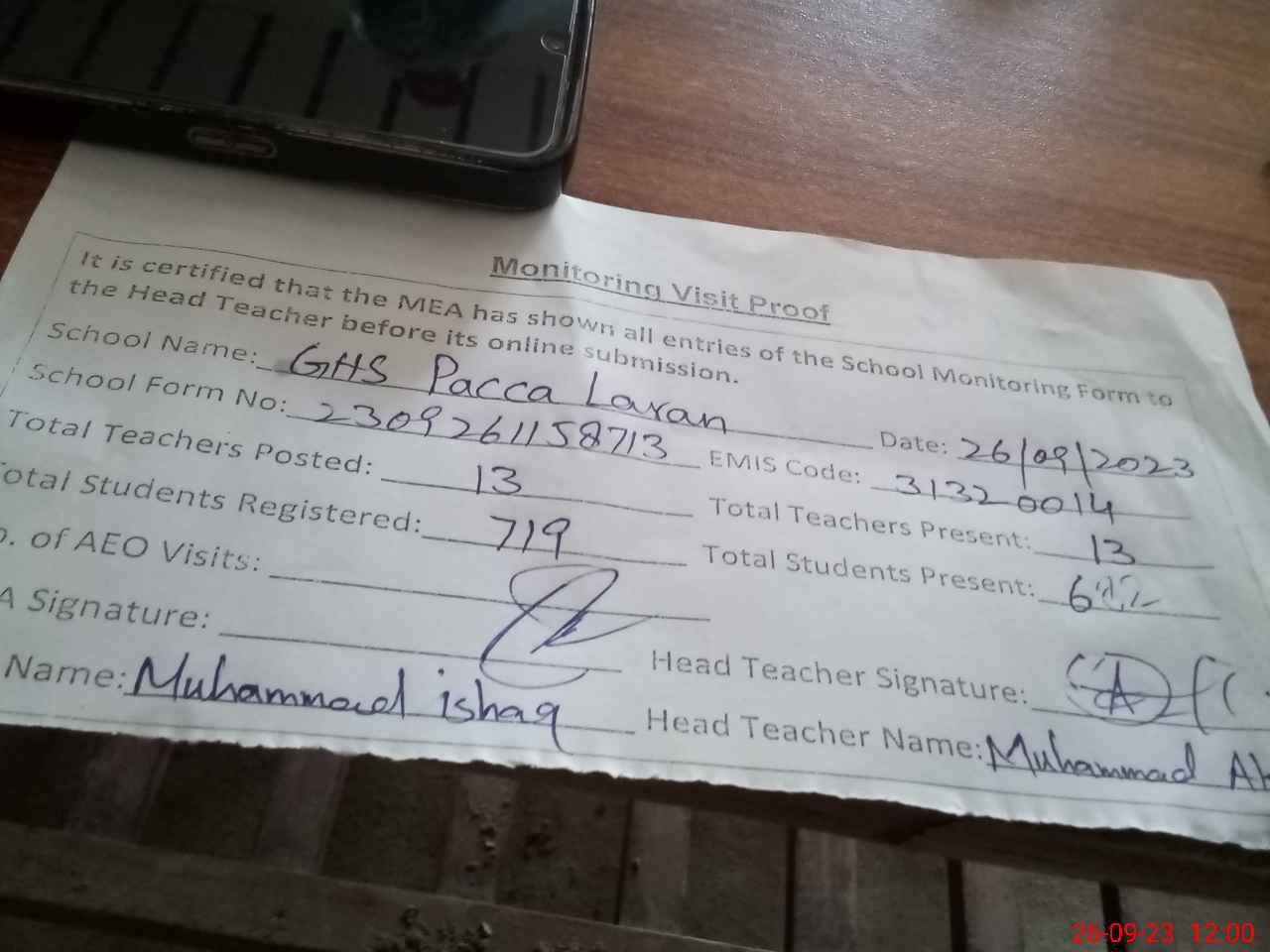 | Attendance Register | Head Teacher | MEA with School | Visit Proof |