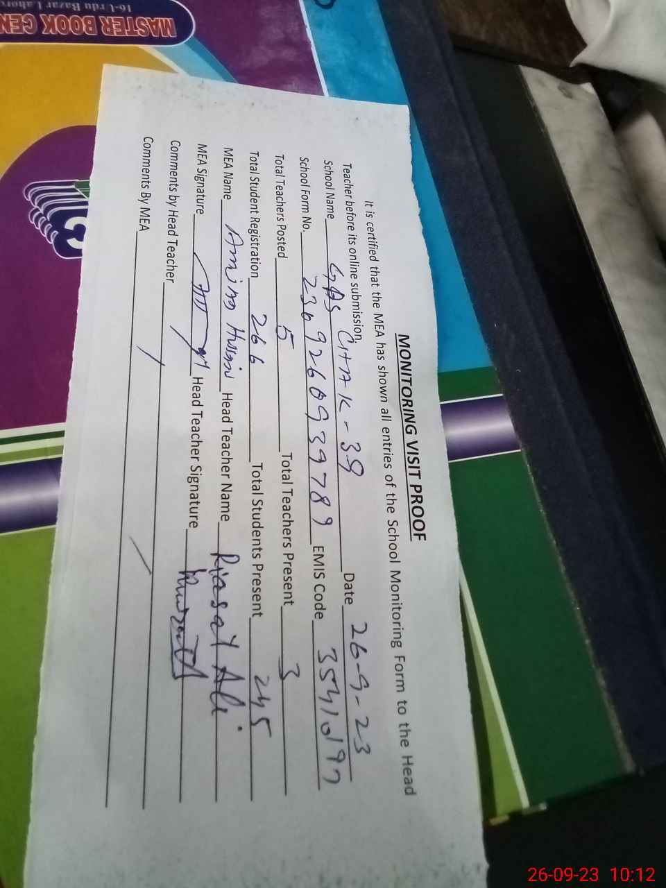 | Attendance Register | Head Teacher | MEA with School | Visit Proof |