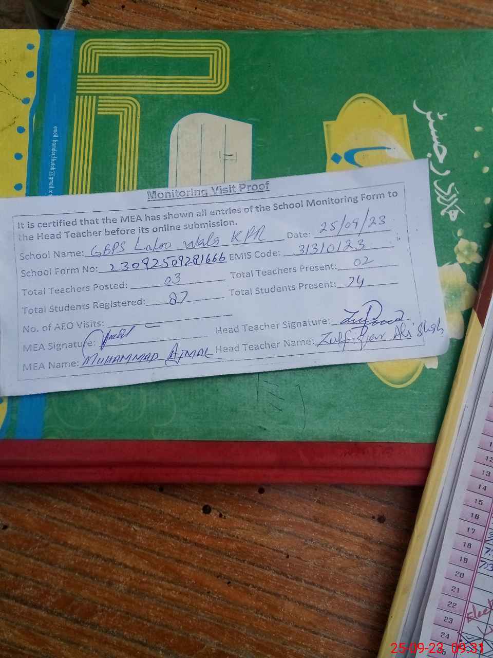 | Attendance Register | Head Teacher | MEA with School | Visit Proof |