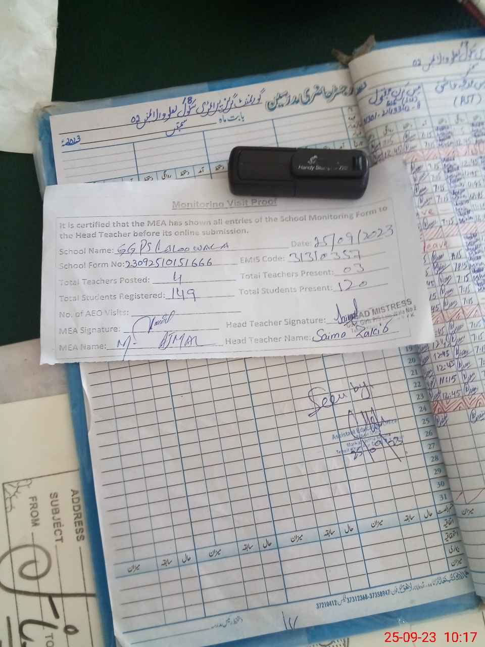 | Attendance Register | Head Teacher | MEA with School | Visit Proof |