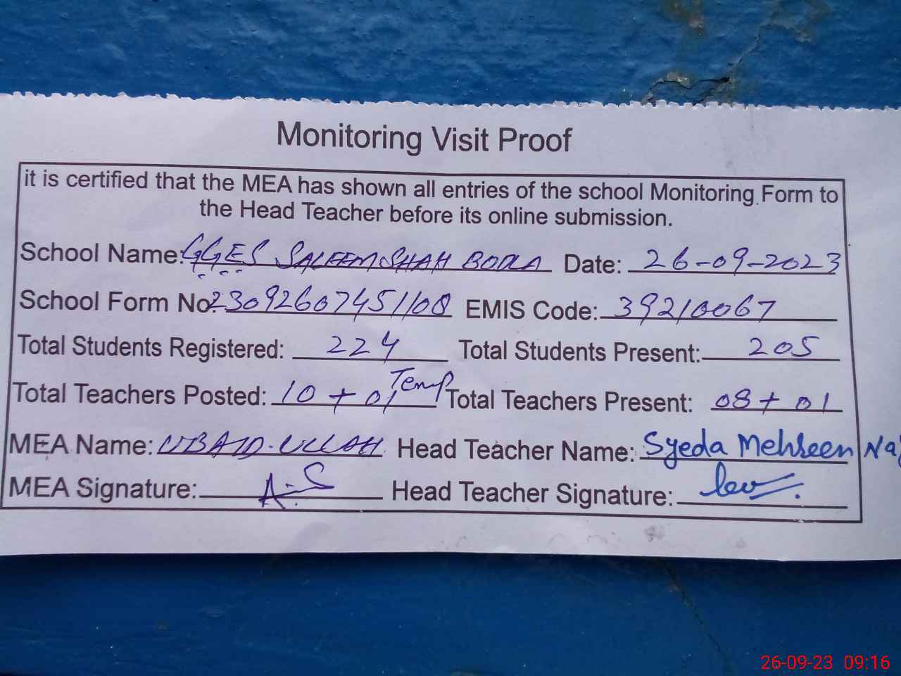 | Attendance Register | Head Teacher | MEA with School | Visit Proof |