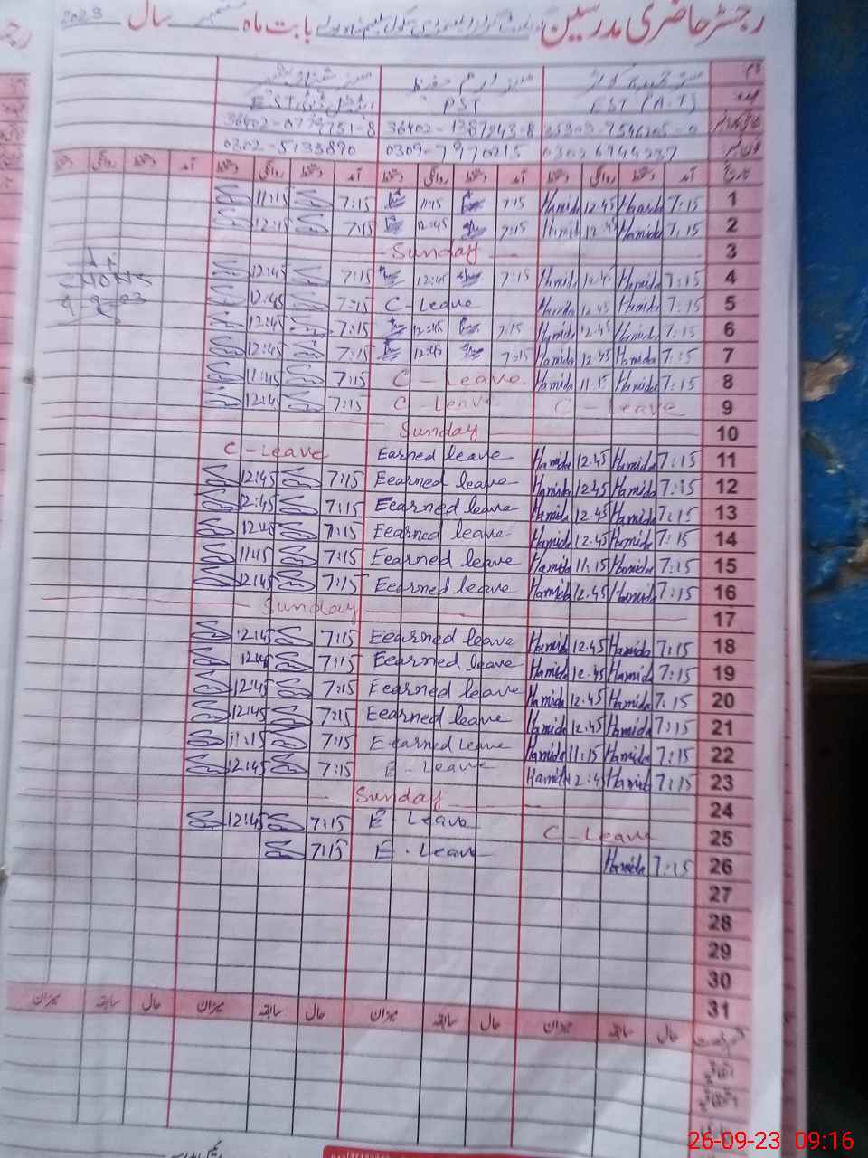 | CNIC | Full Name | Designation | R/C | Absence During Last Calender Month |