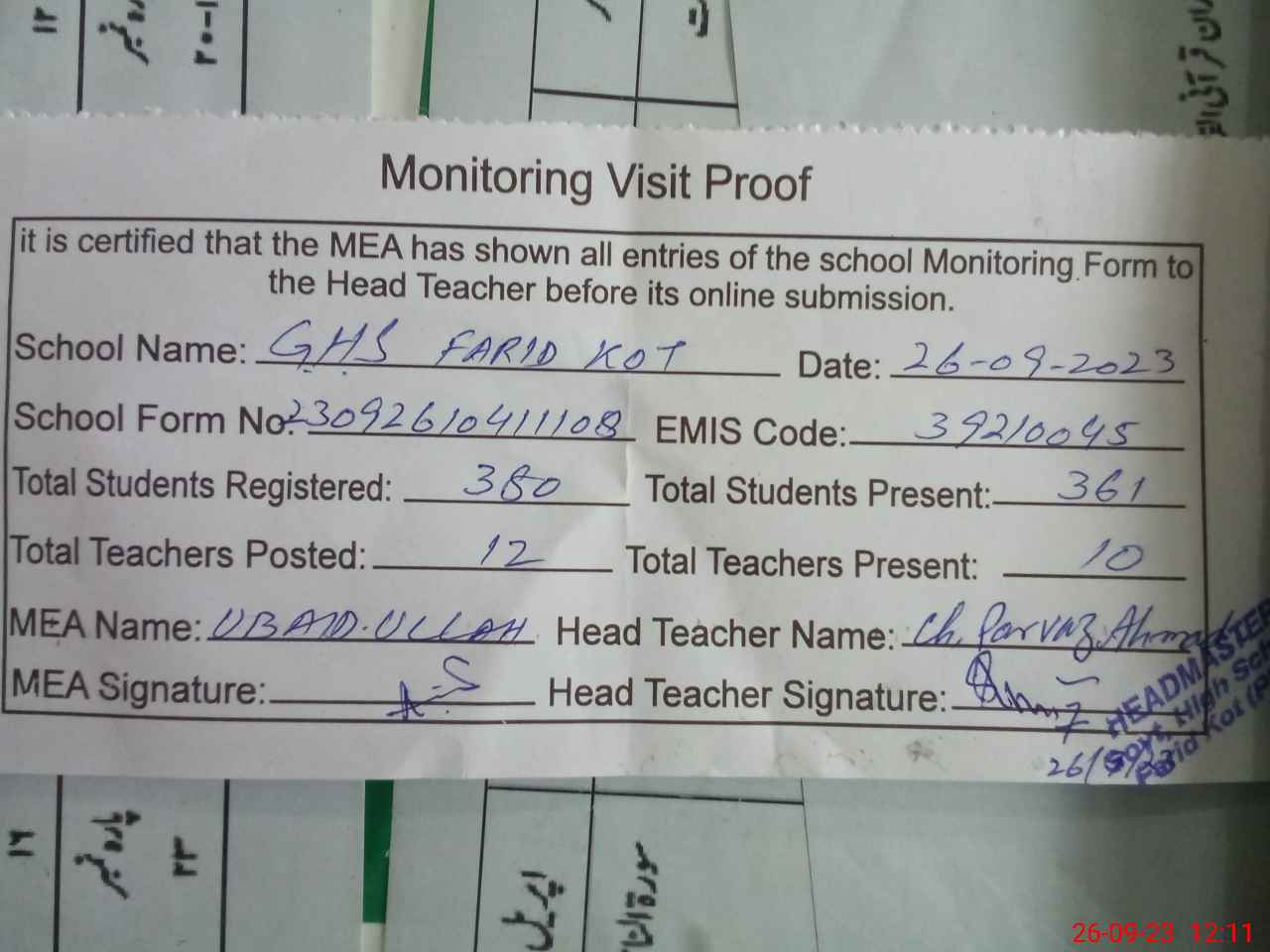 | EMIS Code: 39210045 | Name of School: GHS FARID KOT P/O PAKPATTAN | |||