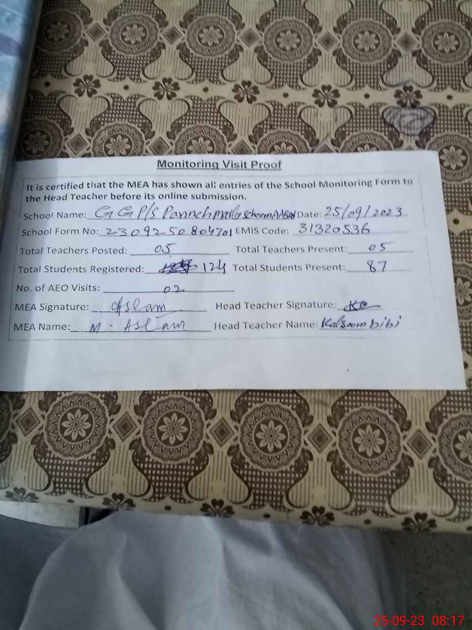 | Attendance Register | Head Teacher | MEA with School | Visit Proof |