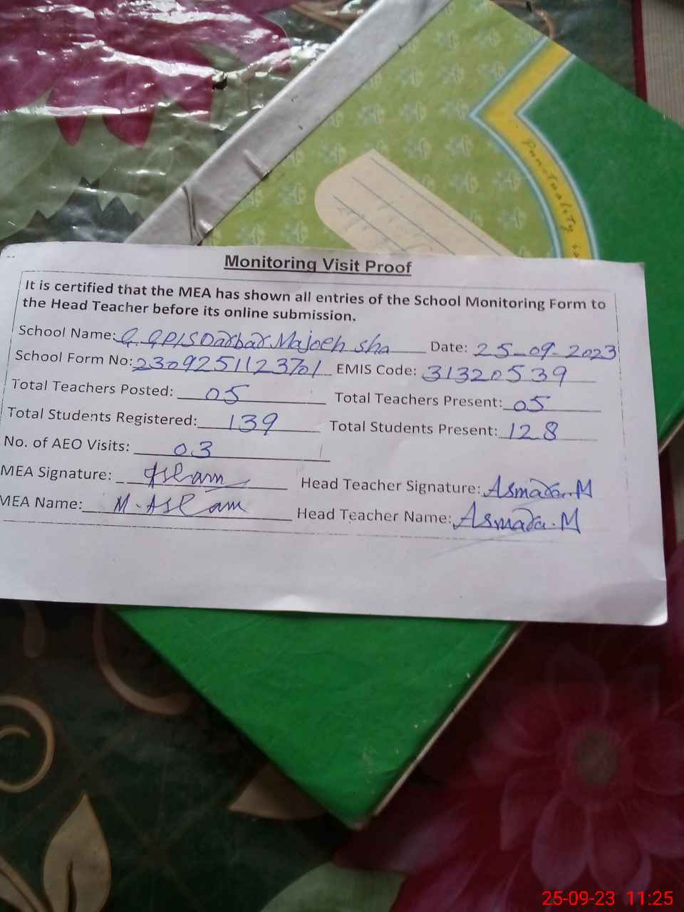 | Attendance Register | Head Teacher | MEA with School | Visit Proof |