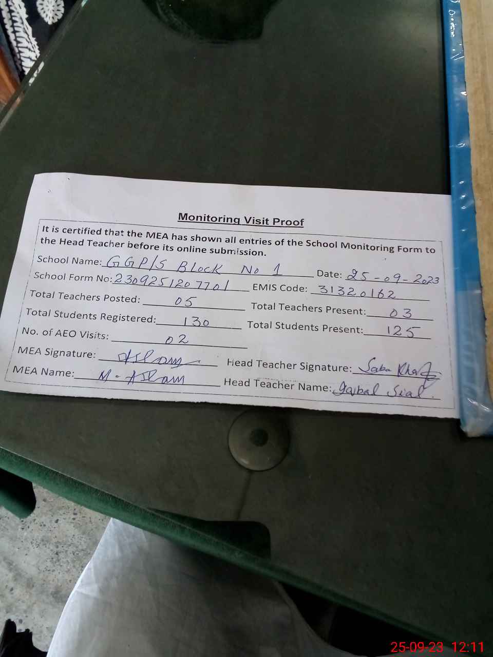 | Attendance Register | Head Teacher | MEA with School | Visit Proof |