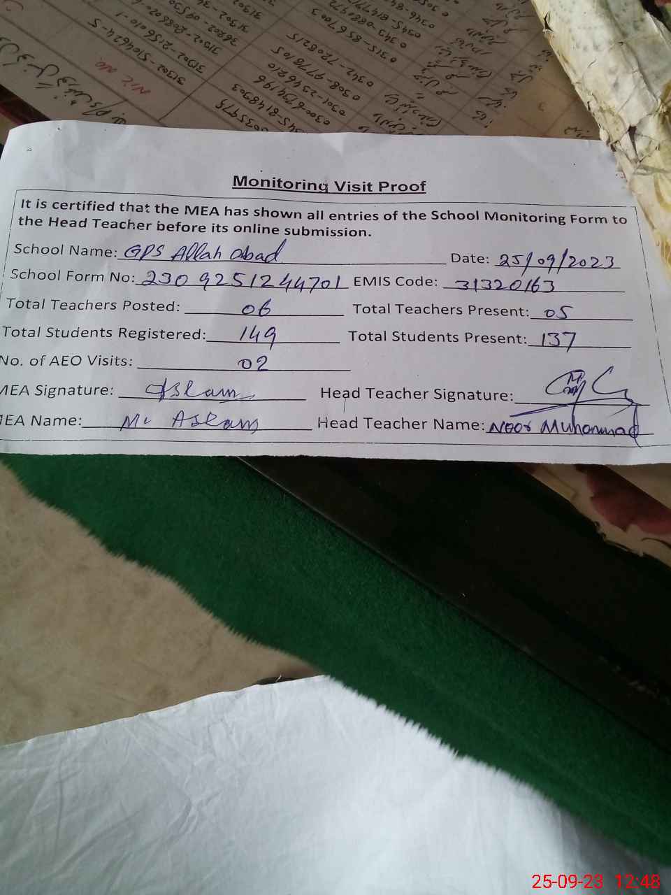 | EMIS Code: 31320163 | Name of School: GPS ALLAH ABAD BLOCK NO 2 | |||