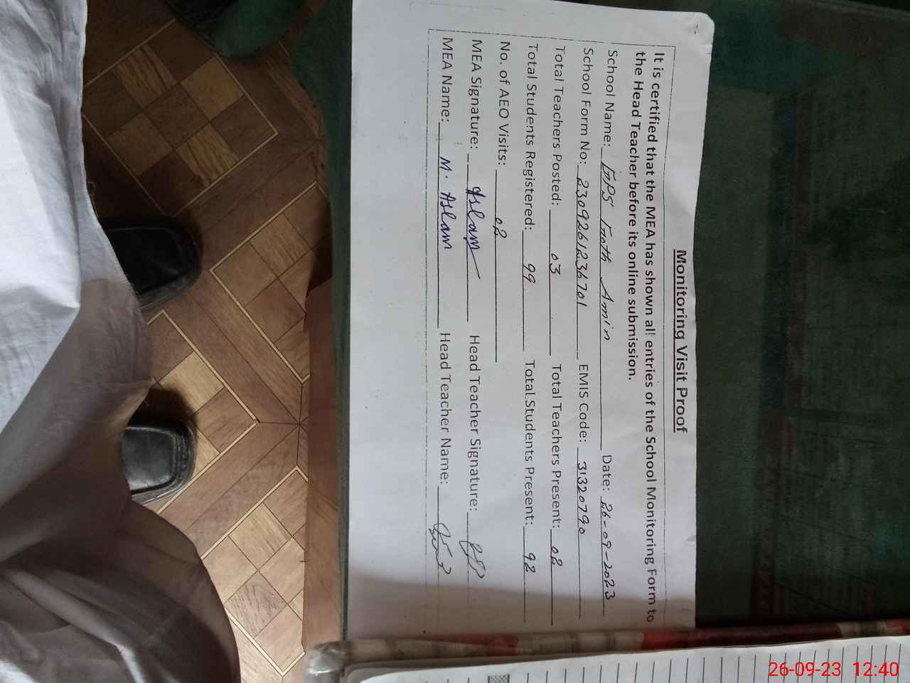 | Attendance Register | Head Teacher | MEA with School | Visit Proof |